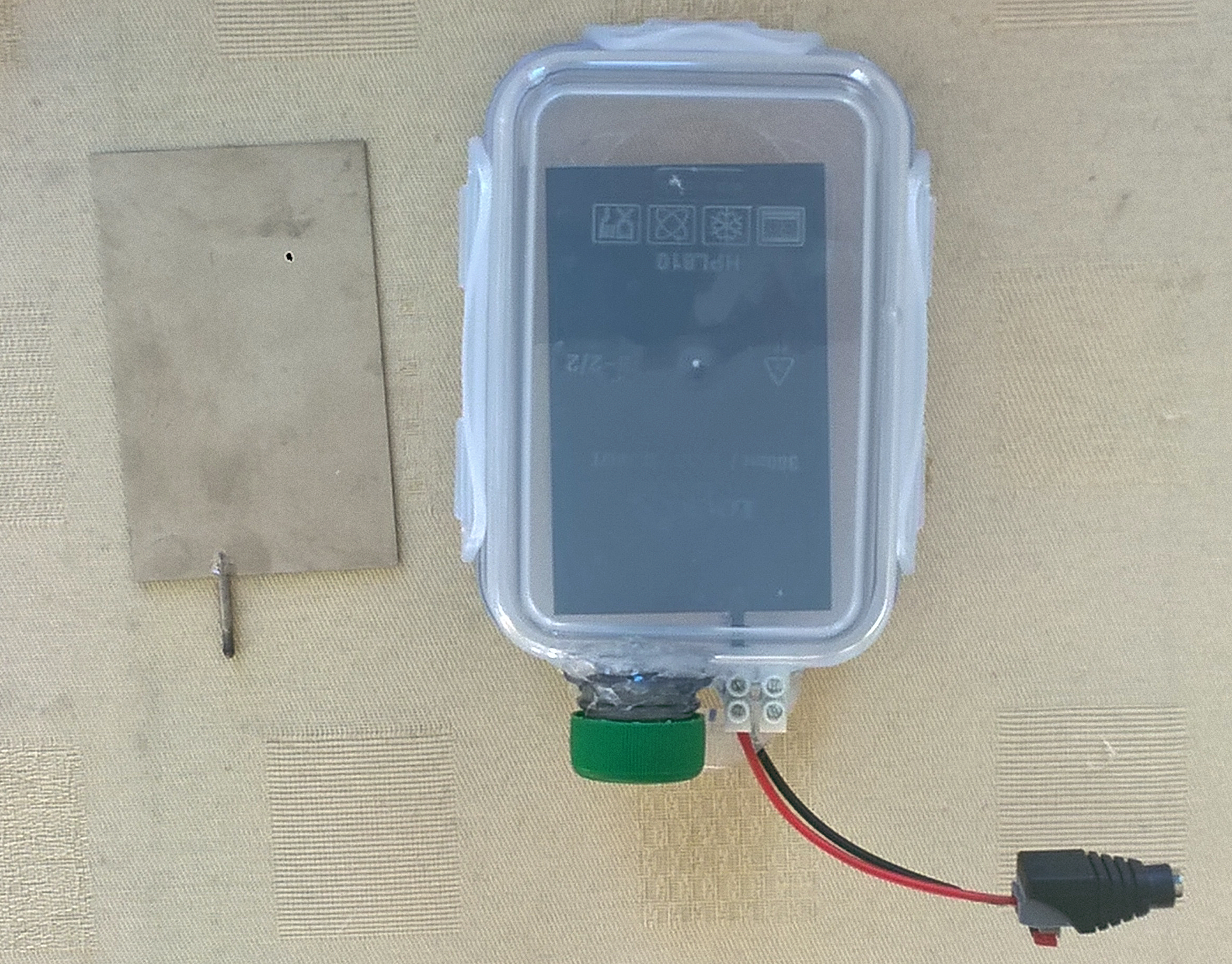 Bildbeschreibung der Dose von oben: Im Deckel befinden sich zwei runde Ausschnitte, die mit einem 50 mm-Kreisbohrer ausgeschnitten wurden. Neben dem Gehäuse liegt die Titankathode.